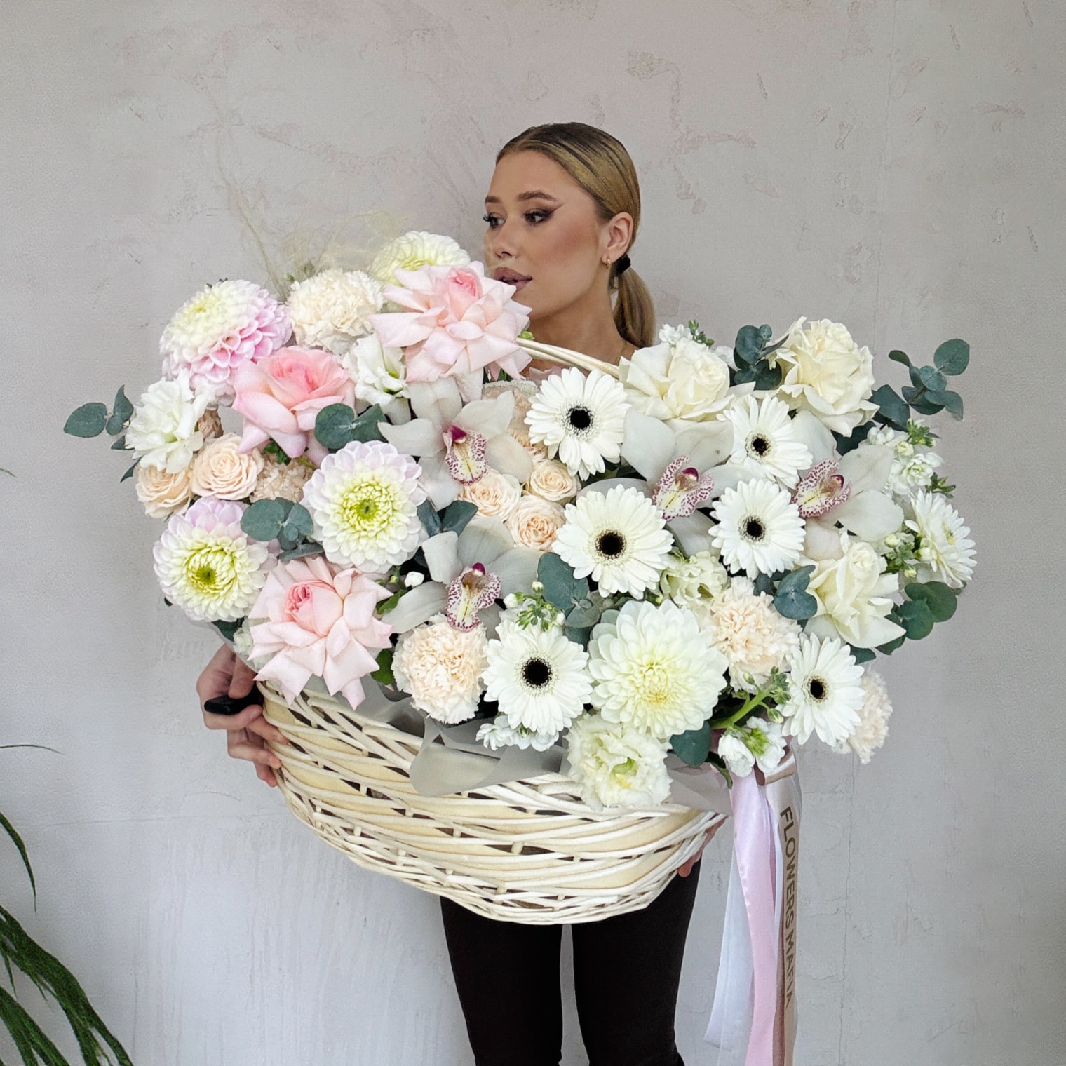 Авторская корзина с крупными розами, георгинами и орхидеями в светло-пудровых тонах от FlowerMafia