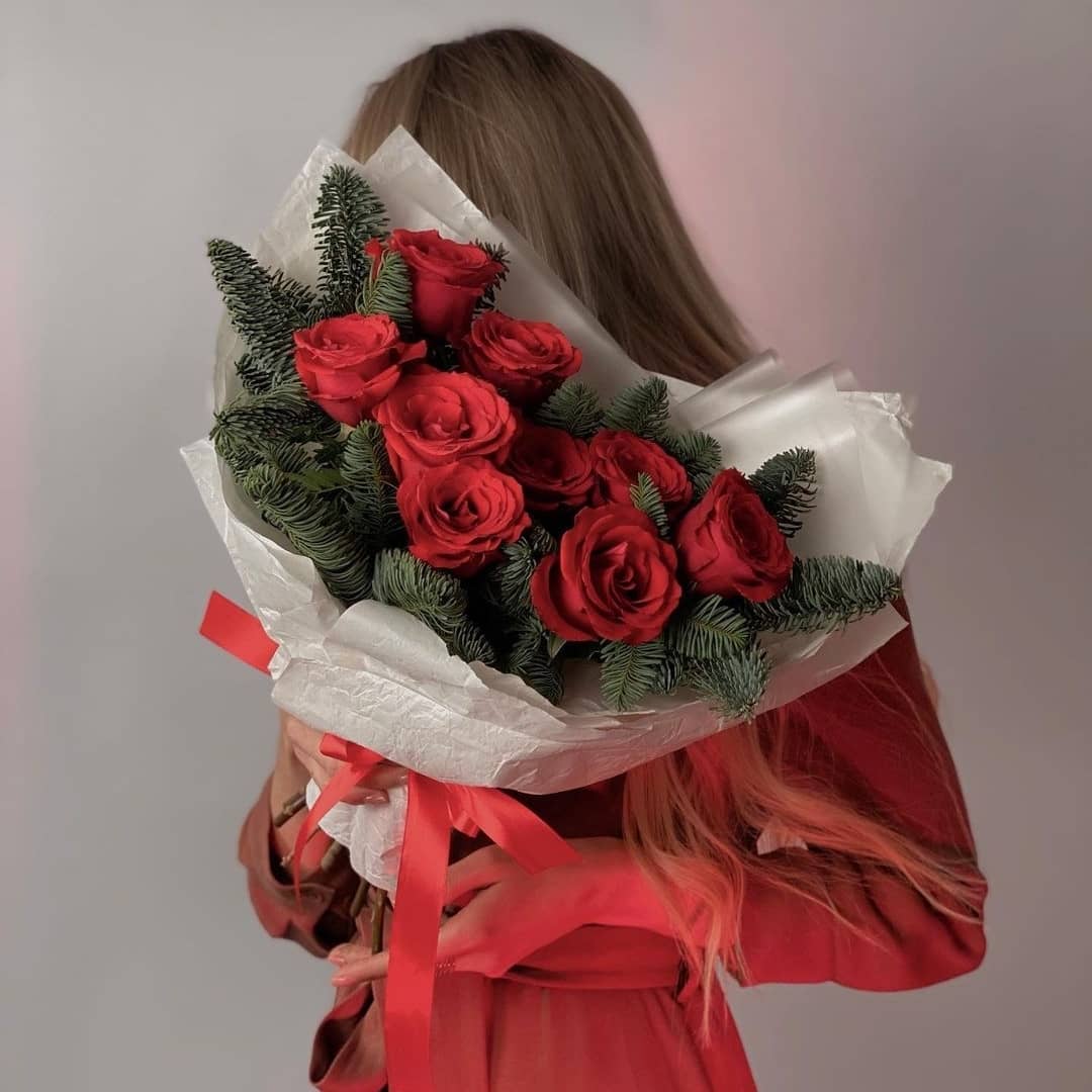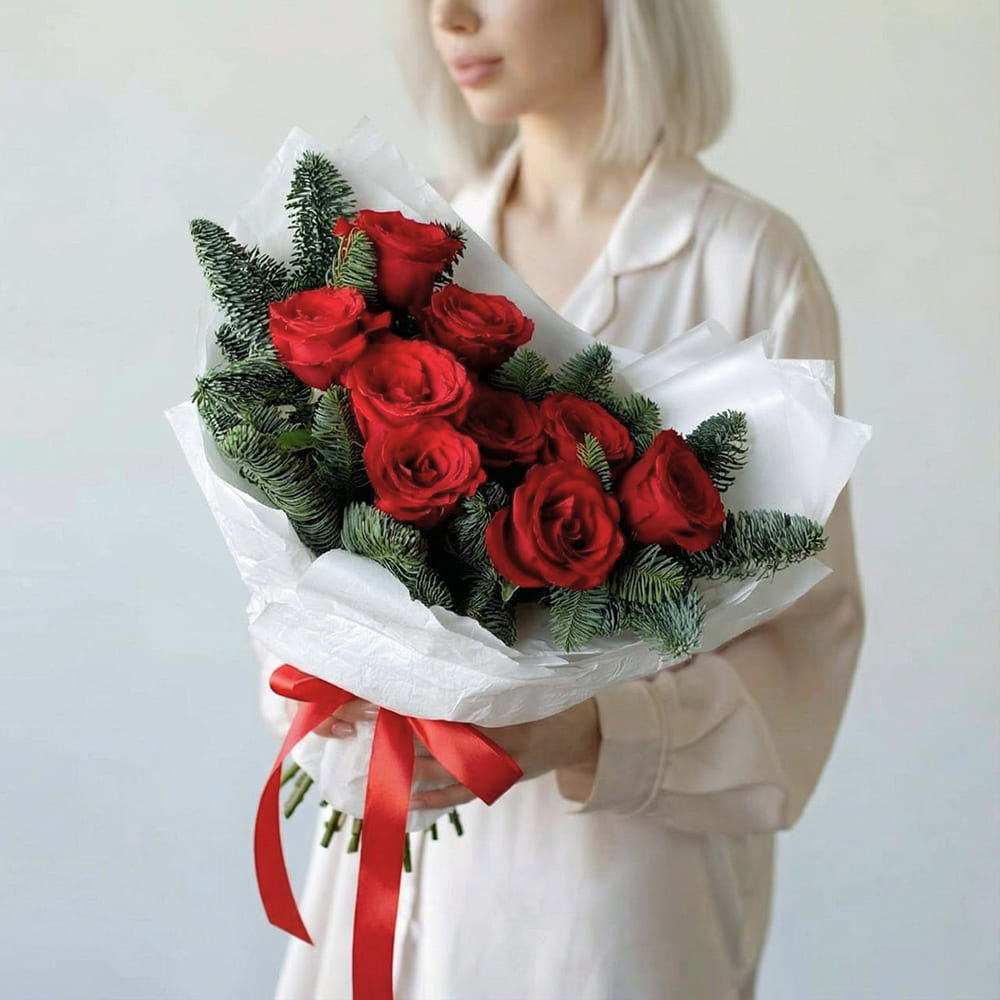 Зимний букет из красных роз и нобилиса «Red Velvet»Зимний букет из красных роз и нобилиса «Red Velvet»