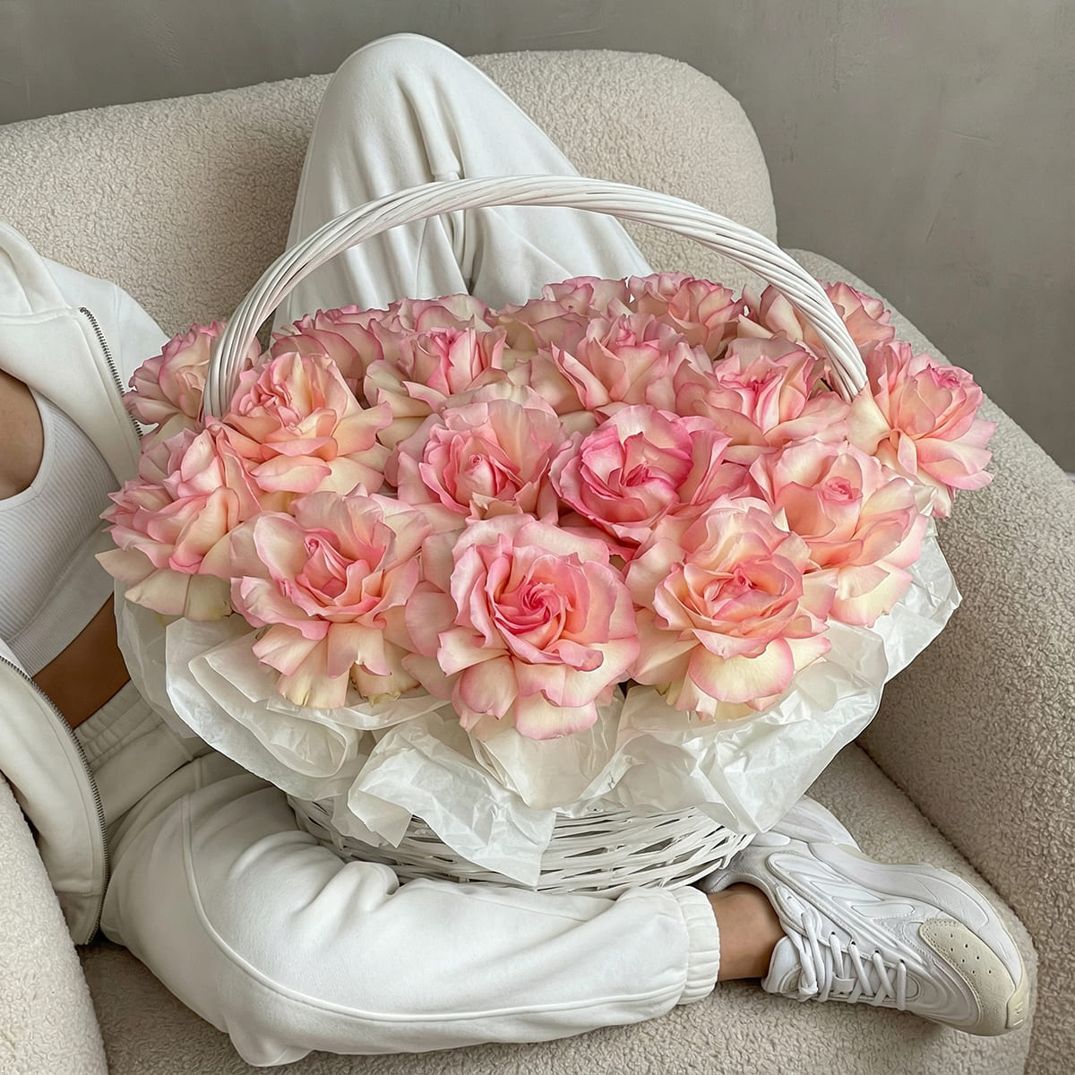 Состав: Французская роза (микс розовый/персиковый) - 19 шт.; Корзина плетеная (белая) - 1 шт.; Оформление (тишью, оазис)