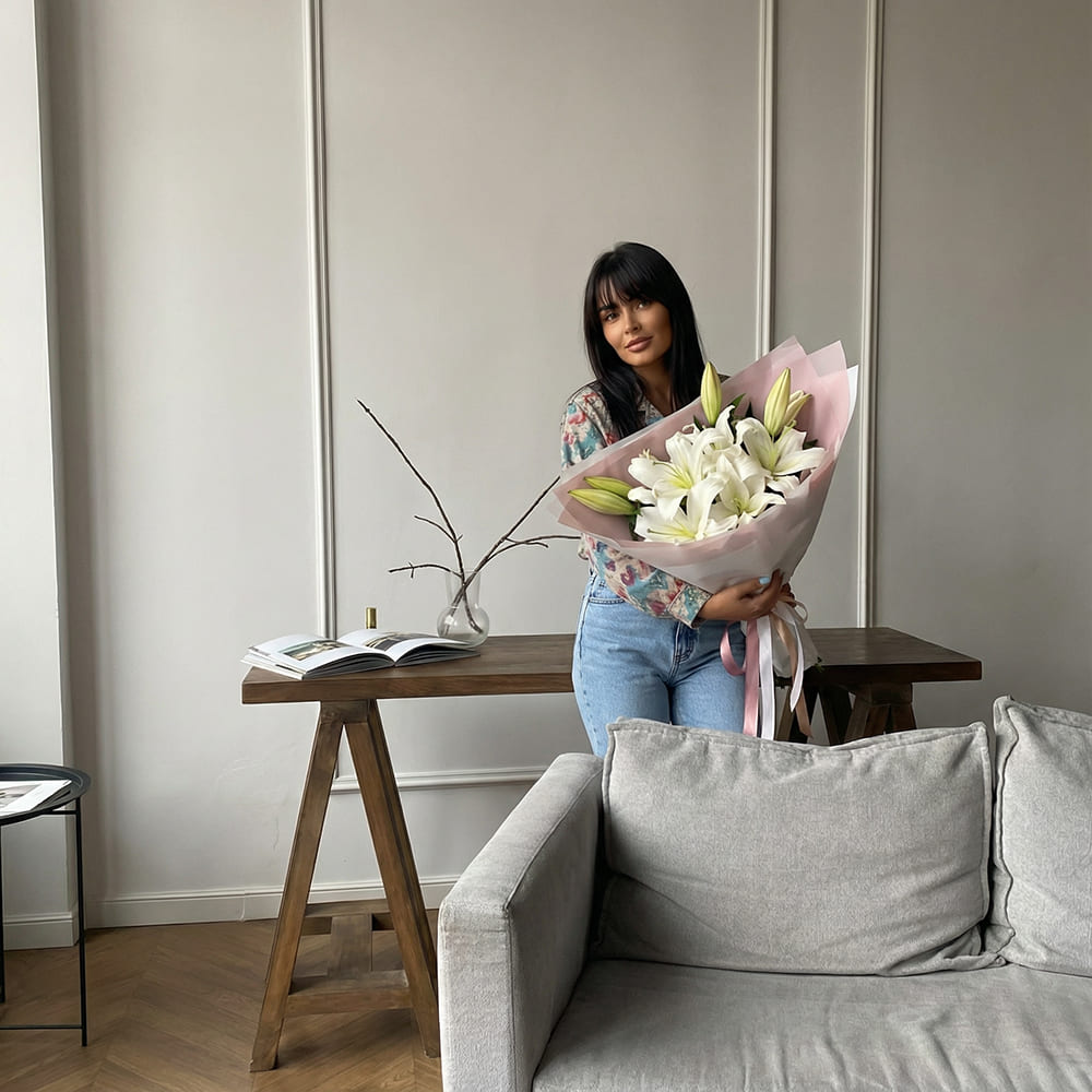 Нежный букет из 5 веток белых лилий в розовой матовой упаковке с атласными лентами