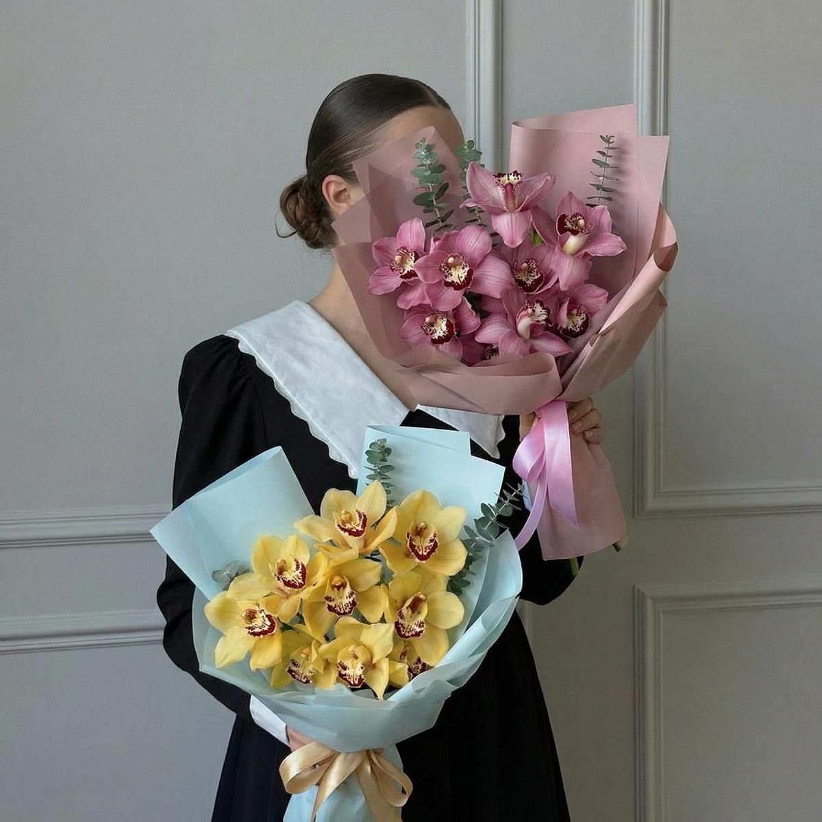 два букета из 9 орхидей: розовый и желтыйдва букета из 9 орхидей: розовый и желтый