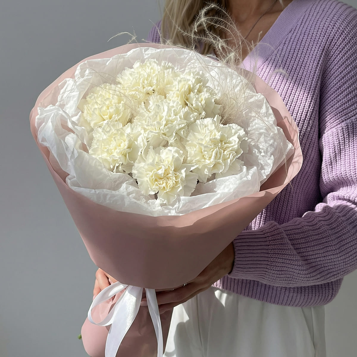 Букет из 7 белых диантусов и ковыля в розовой упаковке стойкий букетКупить букет белых диантусов с ковылем Нижний Новгород