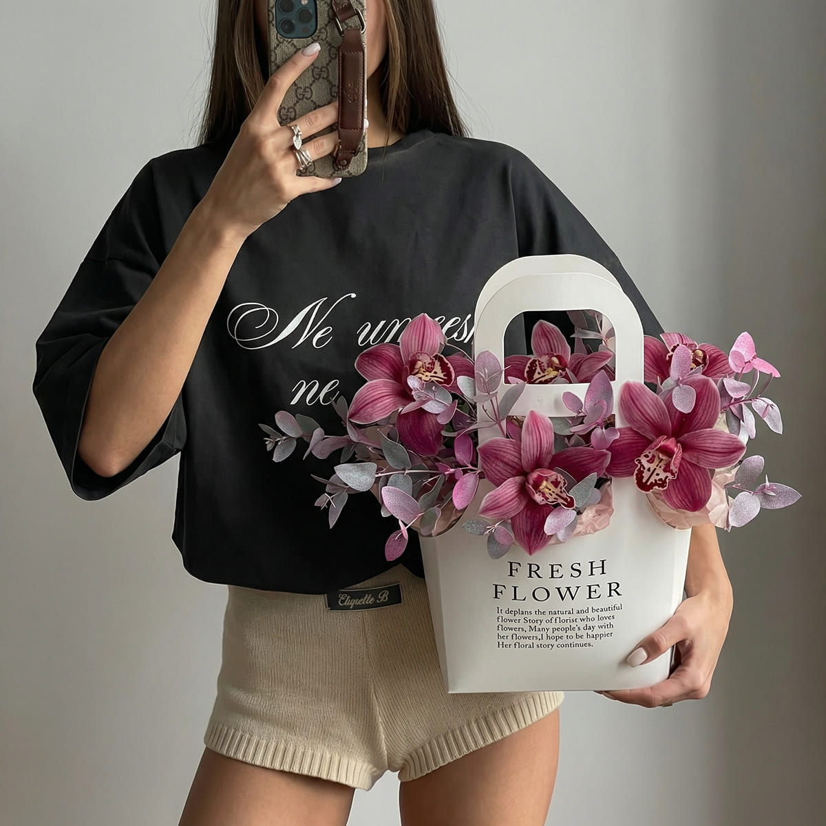 Состав: Орхидея Цимбидиум (винная) - 5 шт.; Эвкалипт (декоративный); Коробка-сумочка; Оазис.