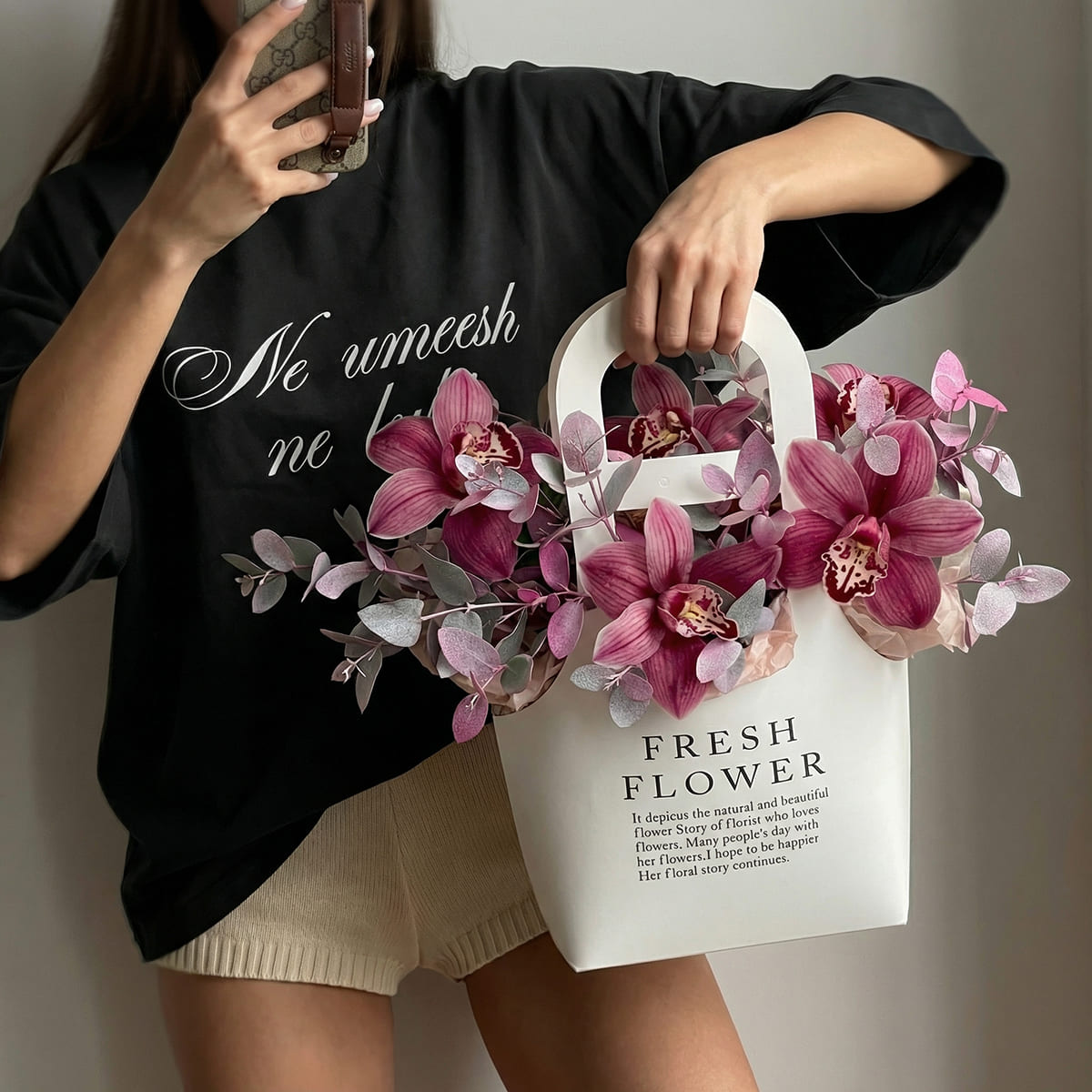 Винные орхидеи с эвкалиптом в стильной белой сумочкеВинные орхидеи с эвкалиптом в стильной белой сумочке