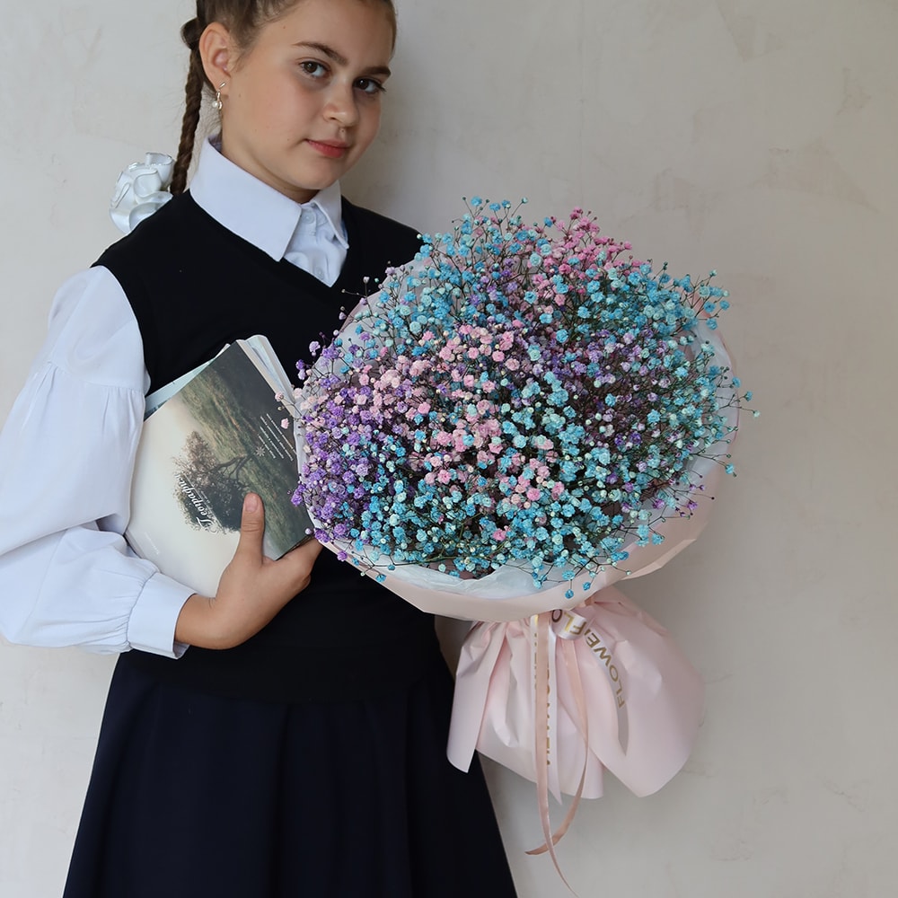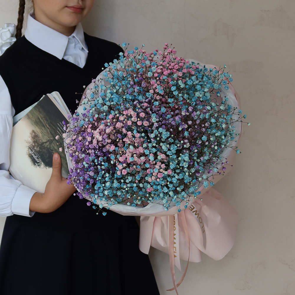 Объемный и воздушный букет из разноцветной гипсофилы. Легкий, яркий и стильный — словно облако из цветов. Отличный выбор для подарка учителю или ученице к 1 сентября.