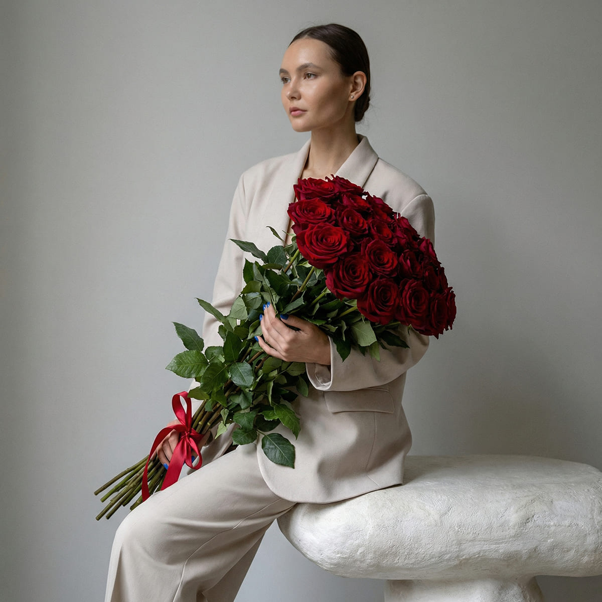 Состав: Роза (метровая) - 21 шт.; Лента.