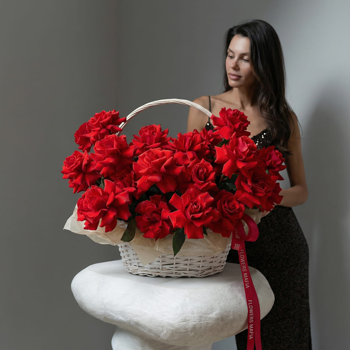 Состав: Французская роза (красная) - 21 шт.; Корзина плетеная (белая) - 1 шт.; Оформление (тишью, лента)