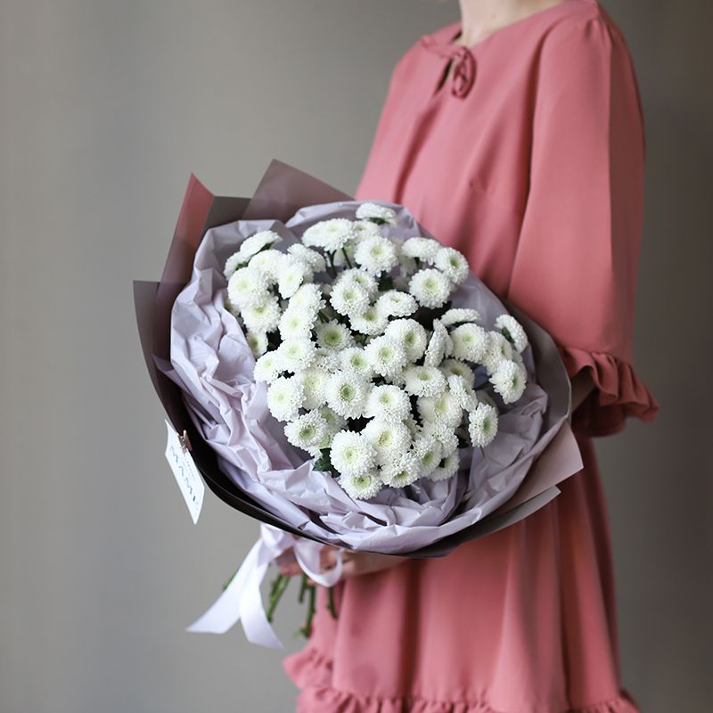 Состав: 11 веток хризантемы сорта Кокос, упаковка, открытка "Самой лучшей МАМЕ".