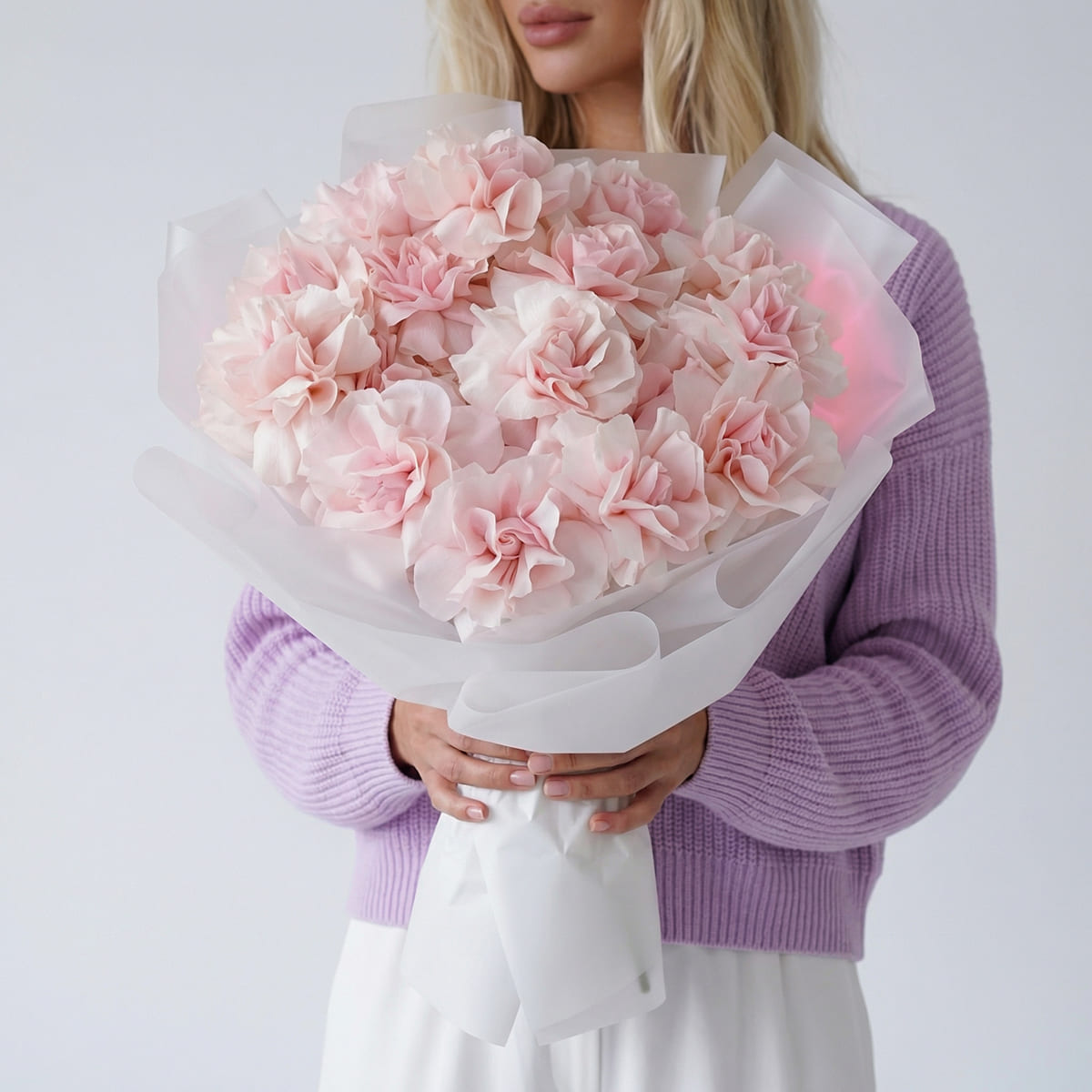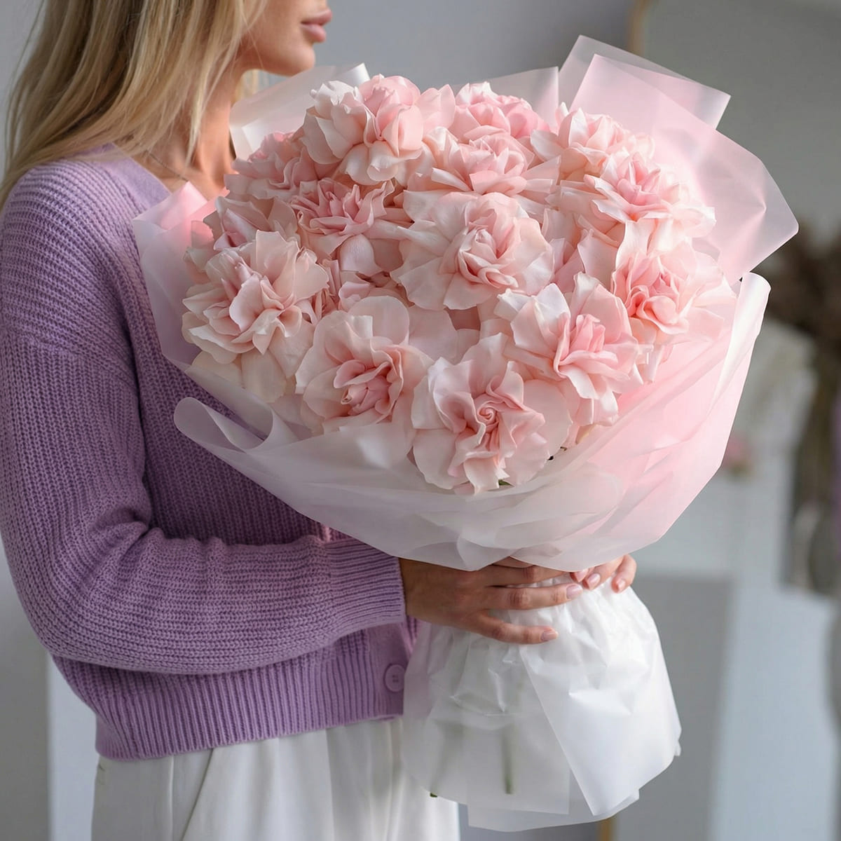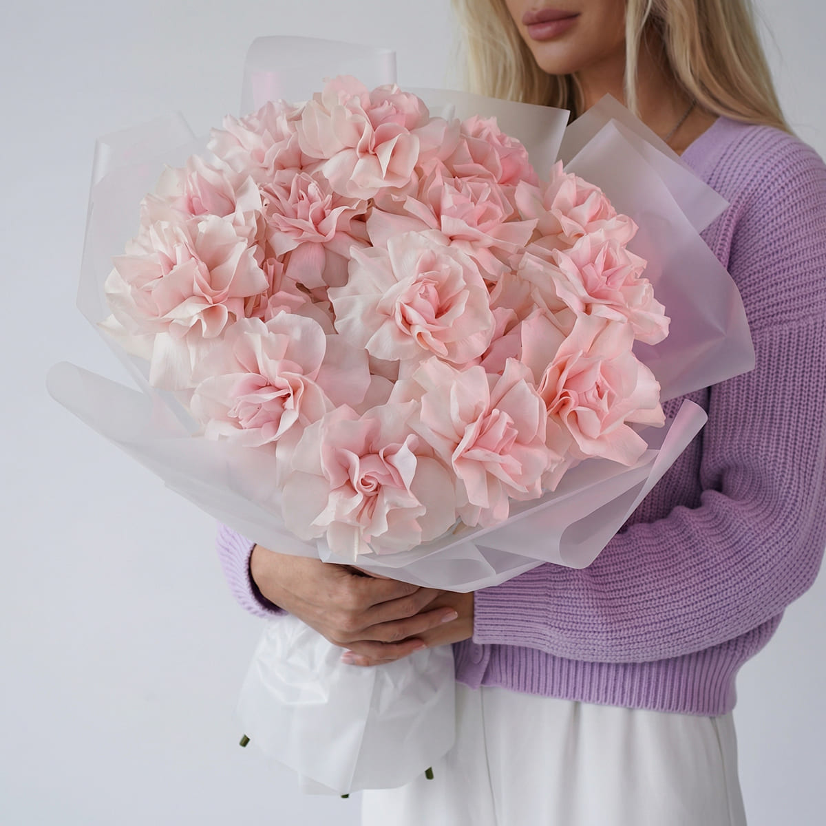 Пышный букет из 15 розовых французских роз в дизайнерской упаковке для девушкиБукет 15 нежно-розовых французских роз фото