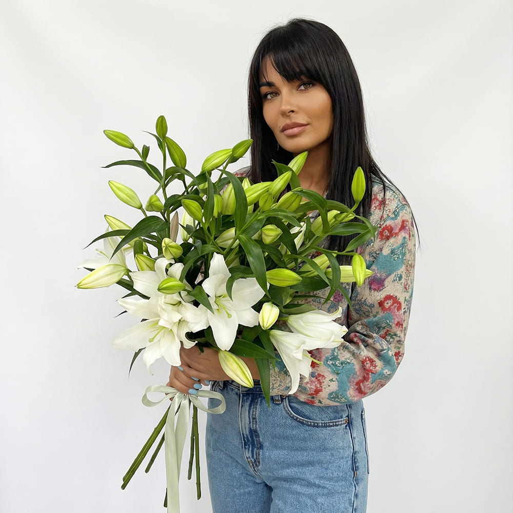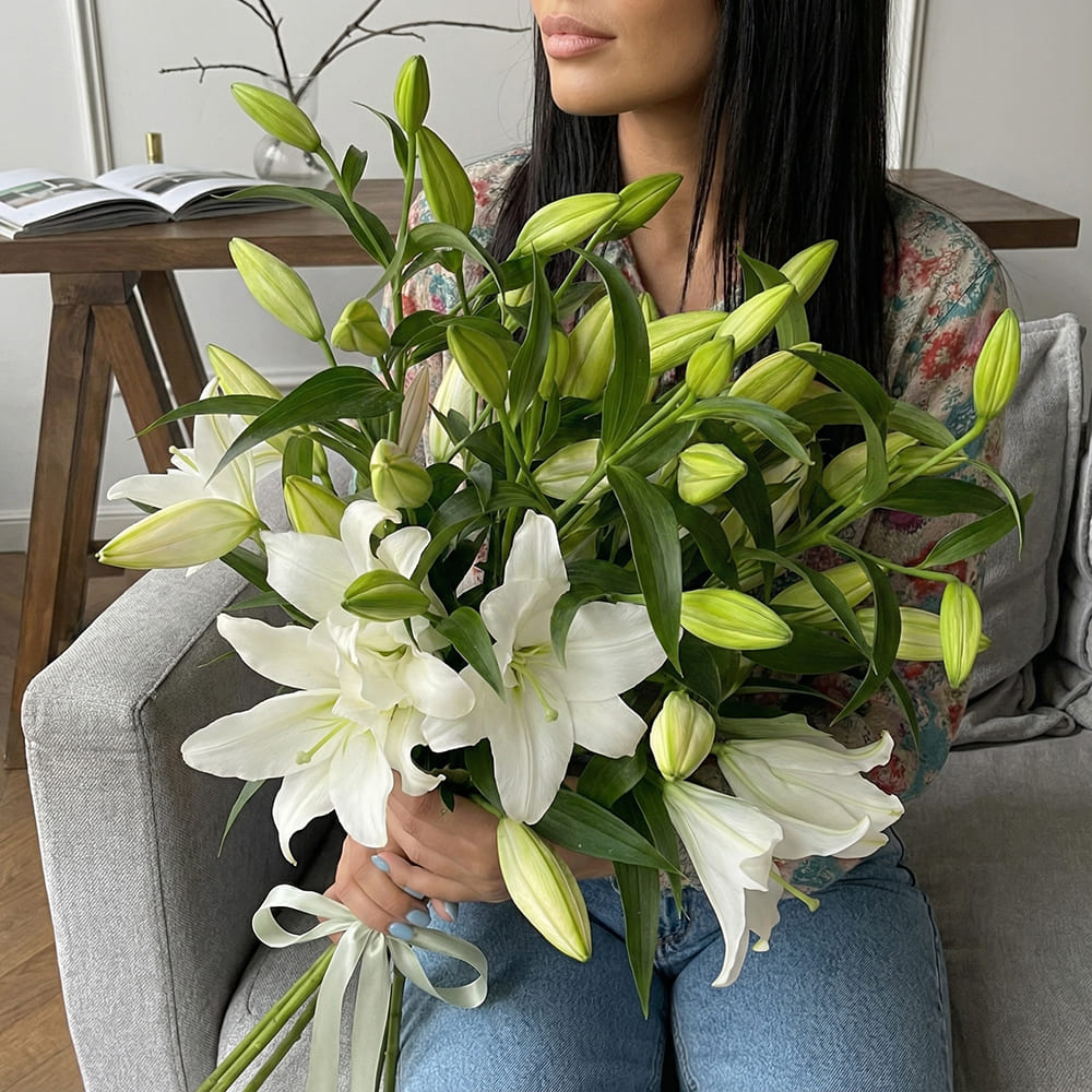 Свежий высокий букет из 7 веток белых лилий с множеством нераскрытых бутонов, перевязанный светло-зеленой лентой