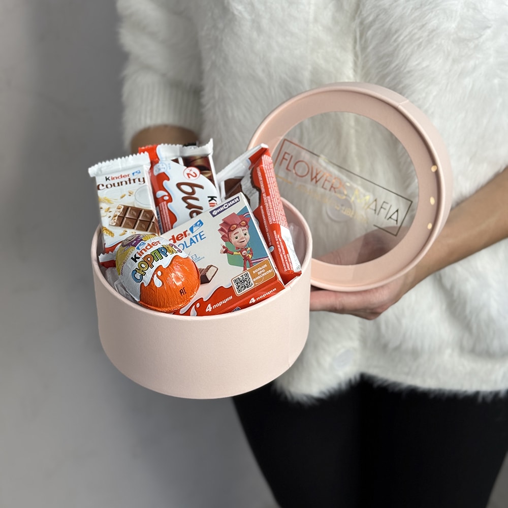 Состав: Kinder Country - 1 шт.; Kinder Bueno - 1 шт.; Kinder Молочный ломтик - 1 шт.; Kinder Chocolate - 1 шт.; Kinder Surprise яйцо - 1 шт.; тишью, подарочный бокс с логотипом FlowerMafia