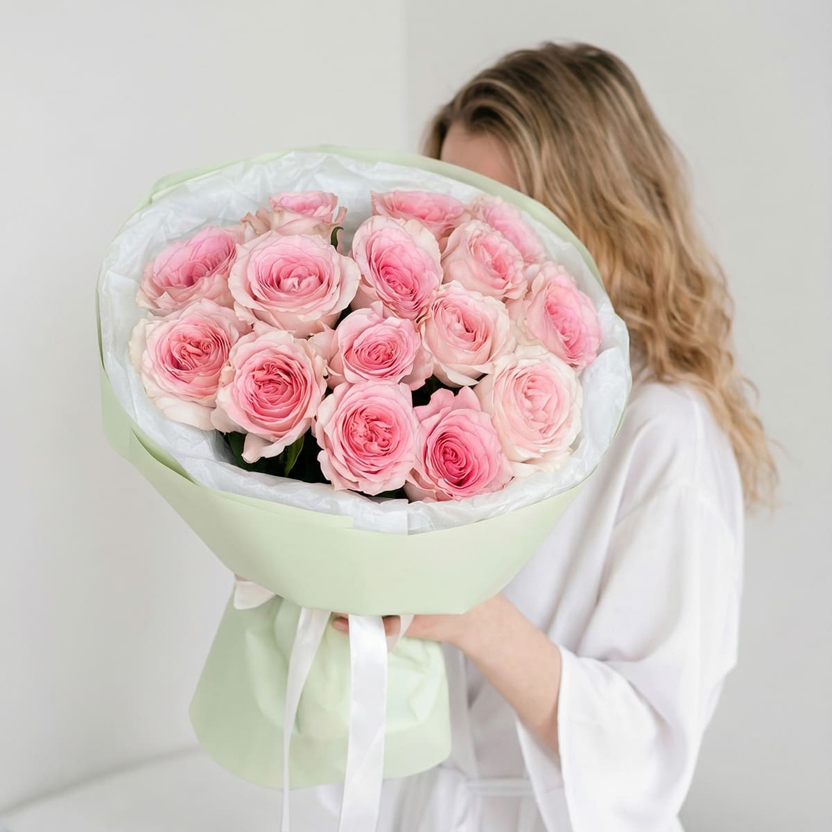 Состав: Роза (розовая) - 15 шт.; Упаковка дизайнерская; Лента.
