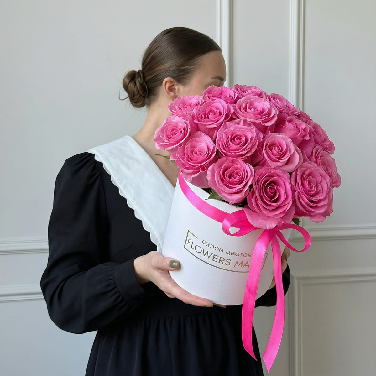 17 ярко-розовых роз в белой шляпной коробке с логотипом17 ярко-розовых роз в белой шляпной коробке с логотипом