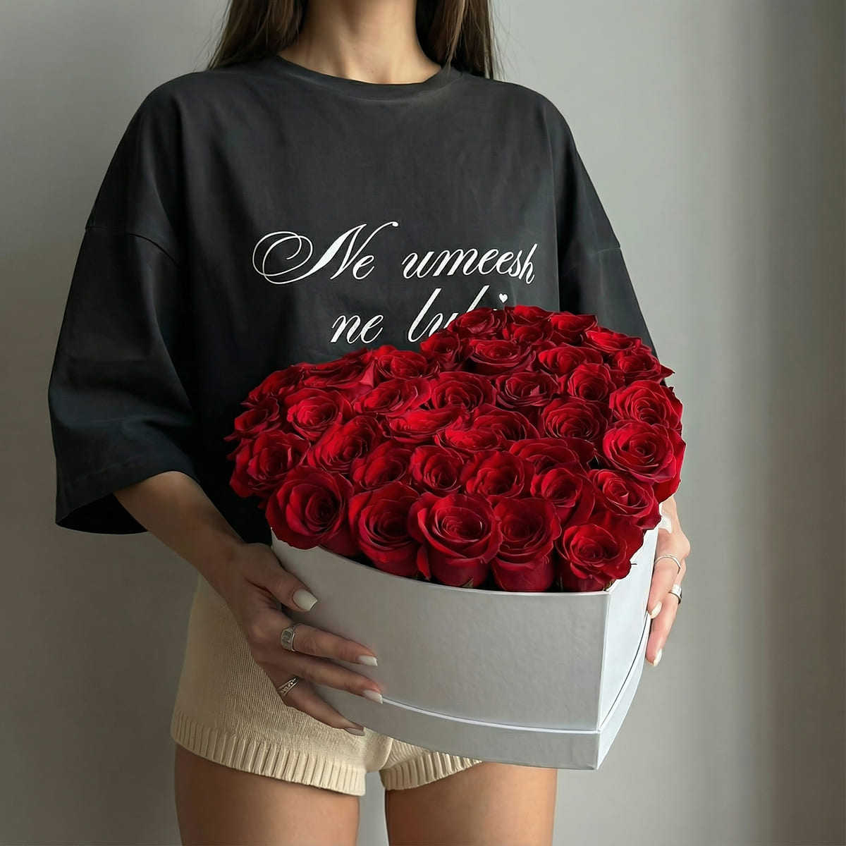 Состав: Роза Кения (красная) - 39 шт.; Коробка сердце (белая) - 1 шт.; Оформление (оазис)
