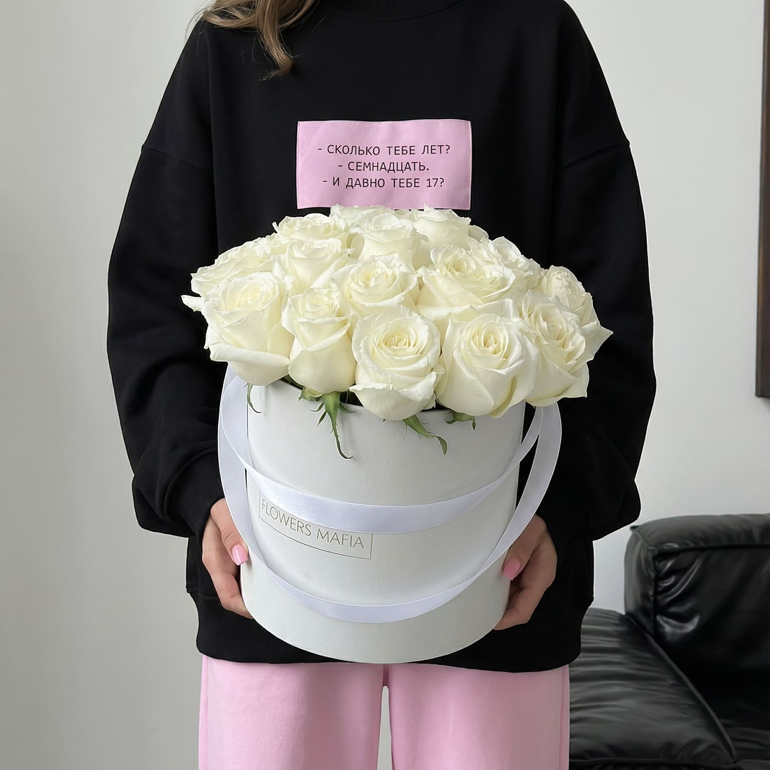 Состав: Роза белая (Эквадор) - 21 шт.; Шляпная коробка (белая) - 1 шт.; Оформление (оазис, лента)