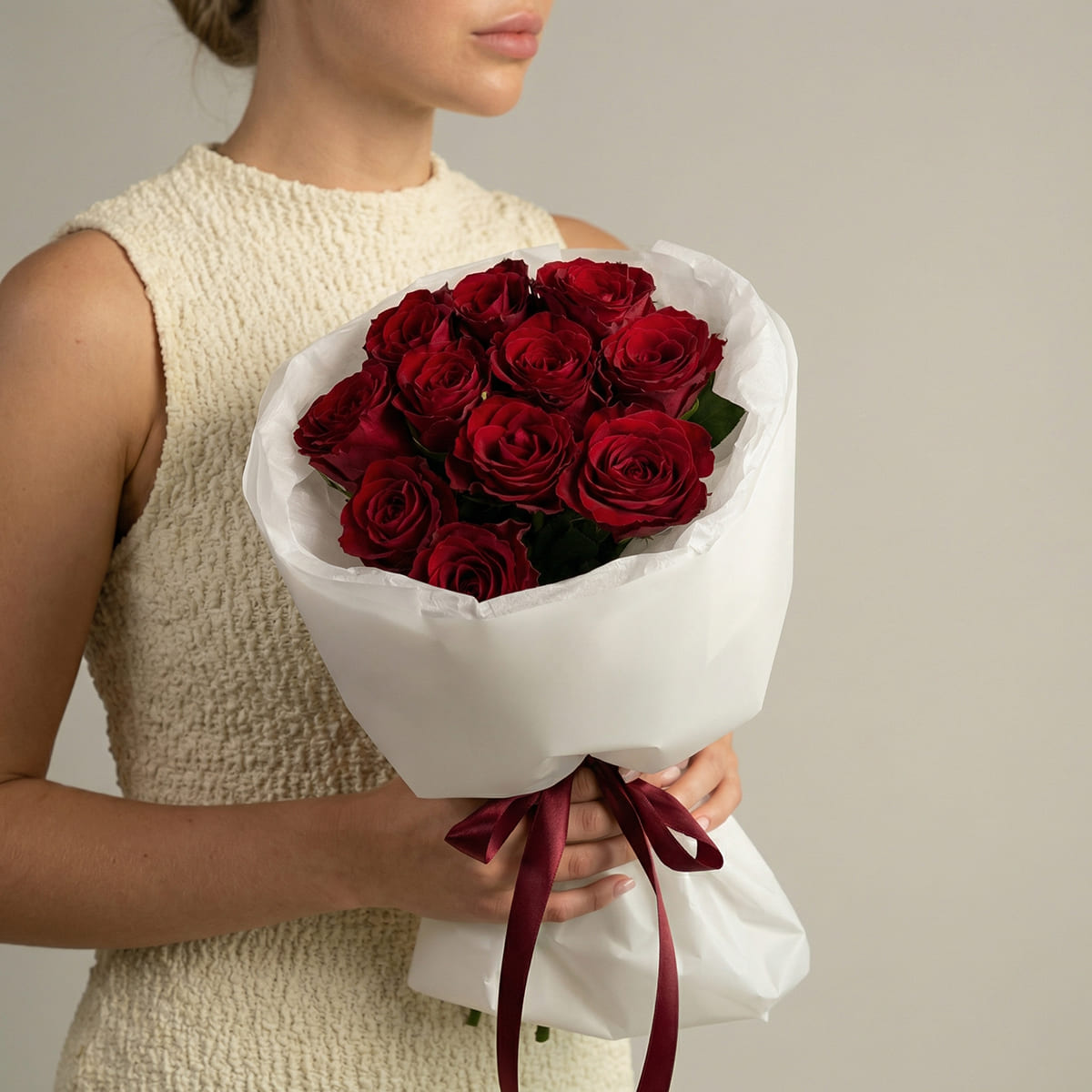 Состав: Роза Кения красная - 11 шт.; Белая матовая упаковка; Лента атласная.
