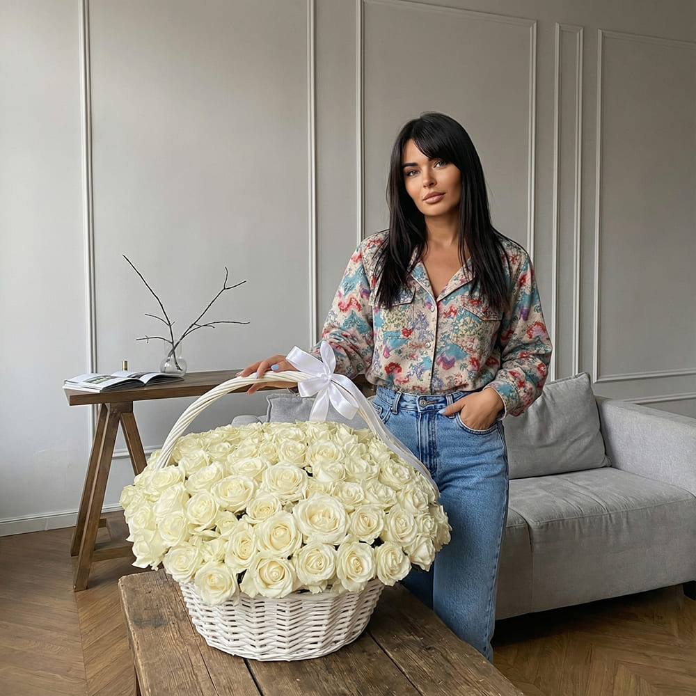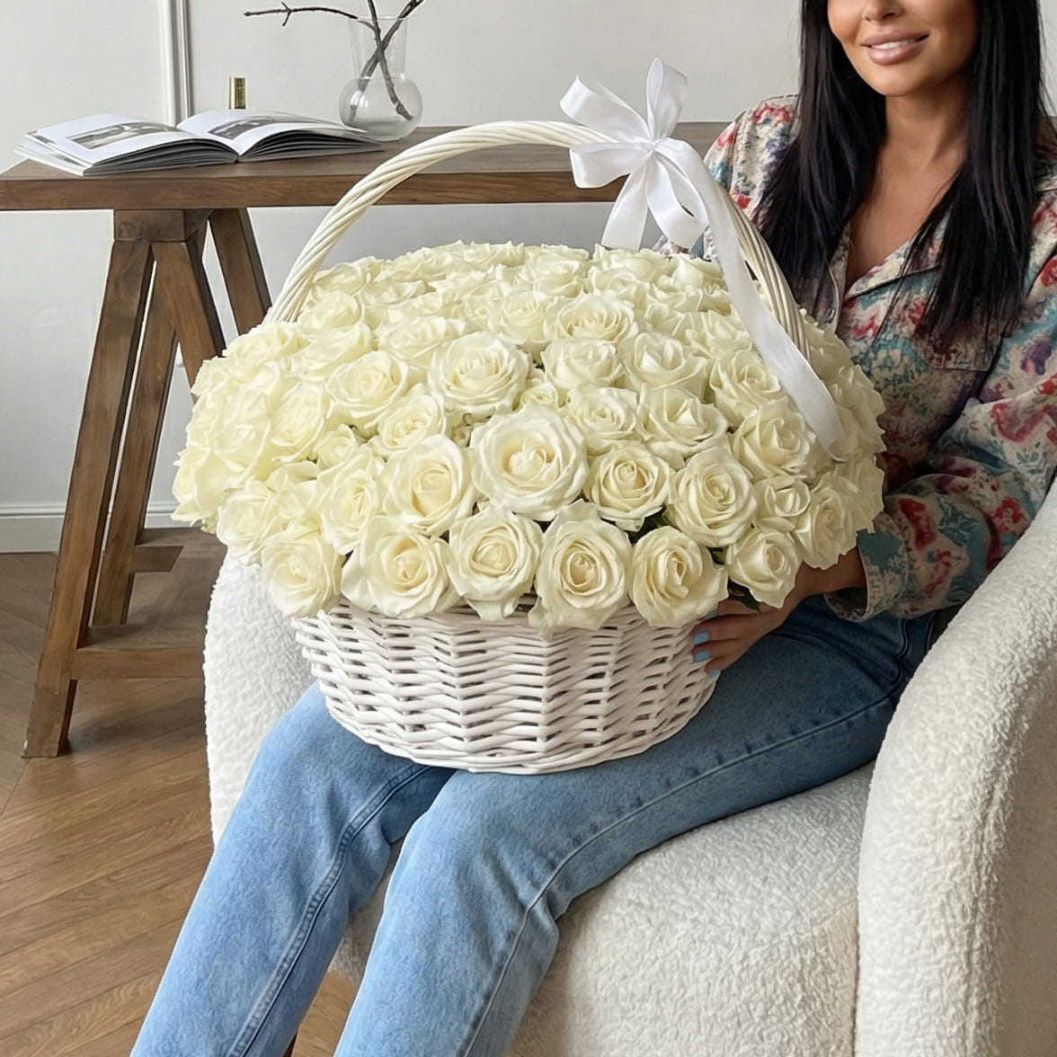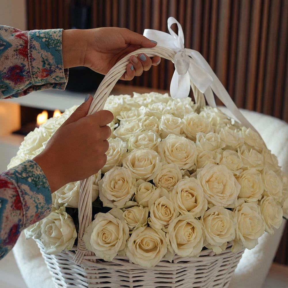 Большая белая плетеная корзина, наполненная 101 белой розой, украшенная атласным бантом на ручке