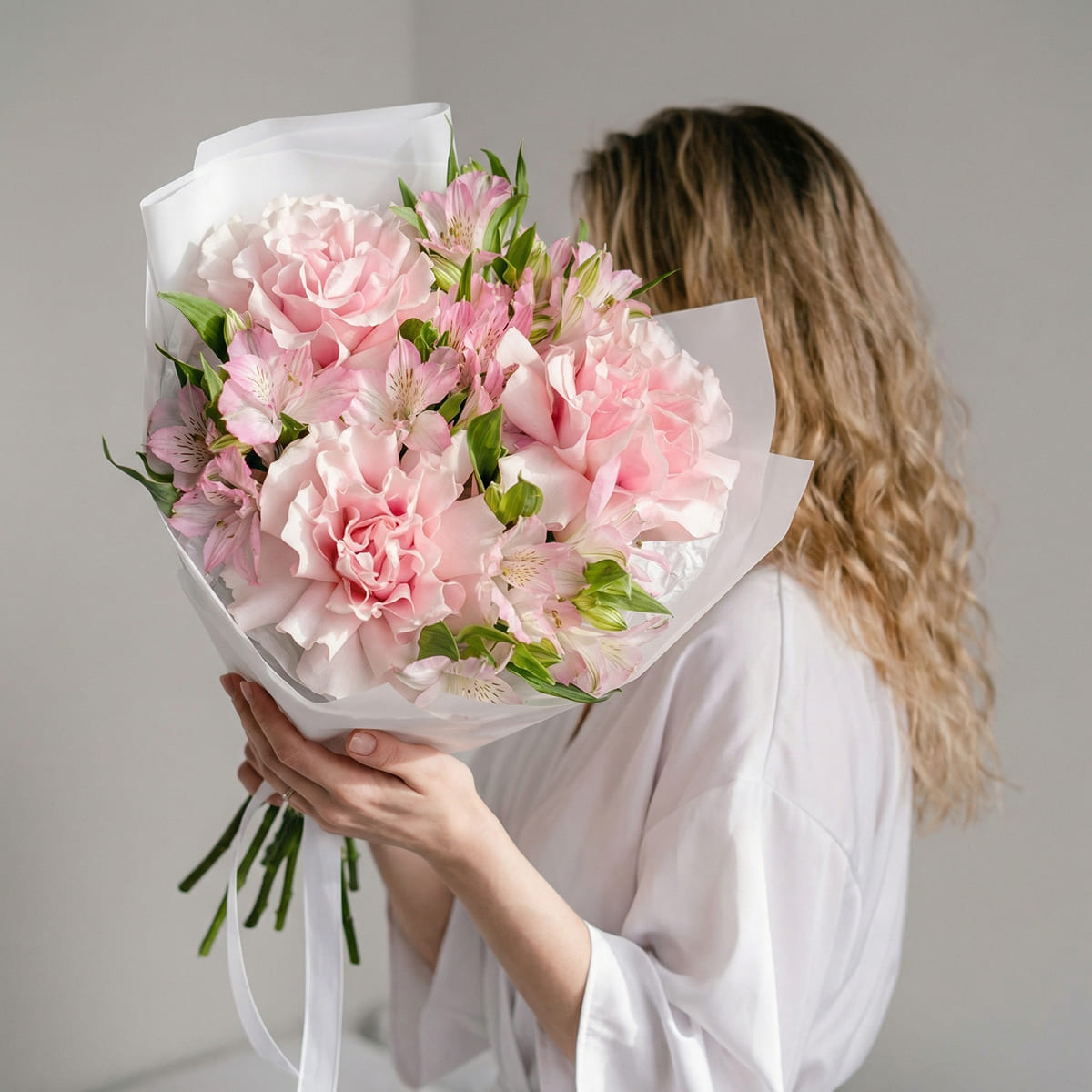 Воздушный букет из 3 розовых вывернутых роз и альстромерии в белой бумаге.buket-francuzskie-rozy-alstromeriya-souffle