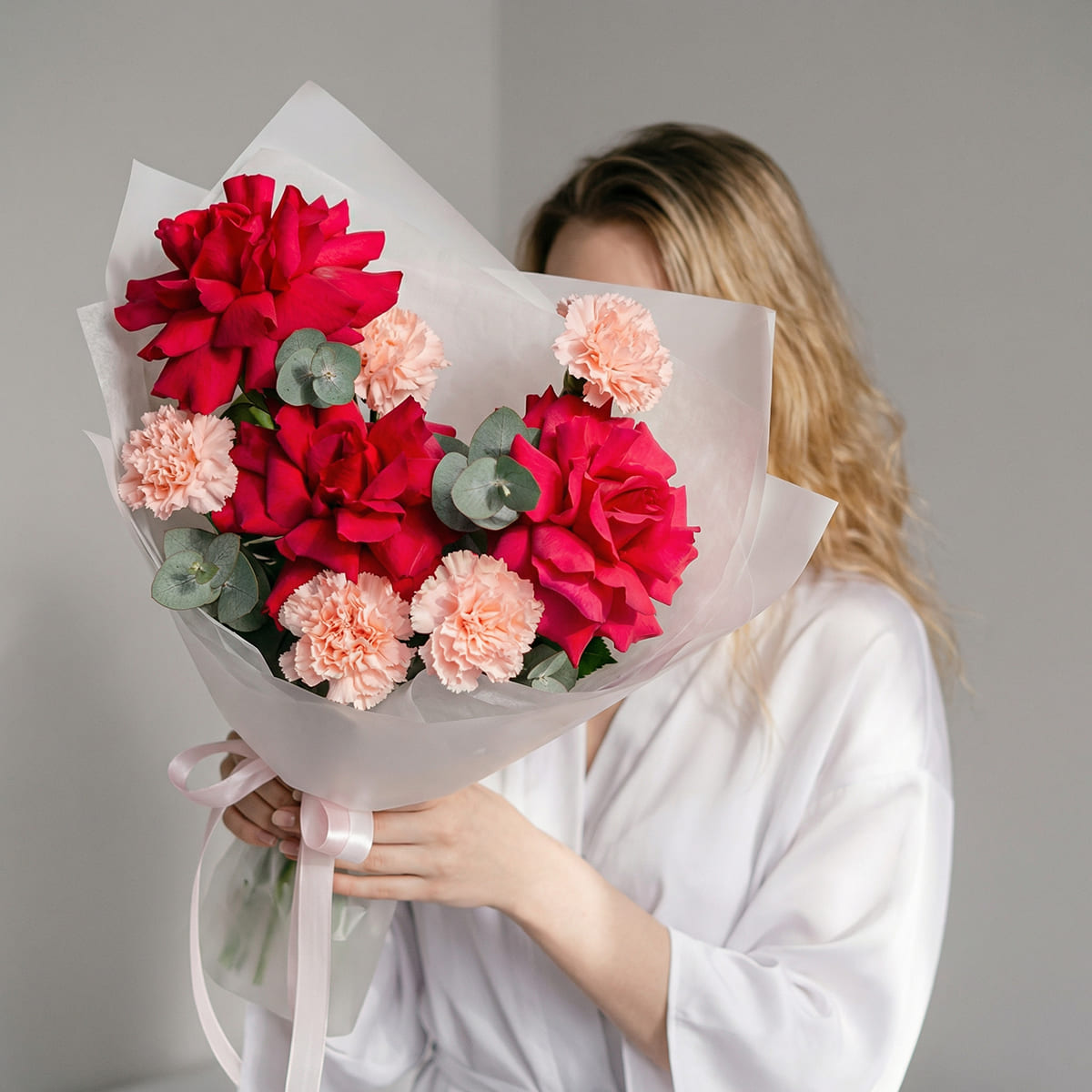 Стильный букет из красных вывернутых роз и розовых гвоздик в белой матовой пленкеbuket-s-frantsuzskimi-rozami-i-diantusami-kupit-nn