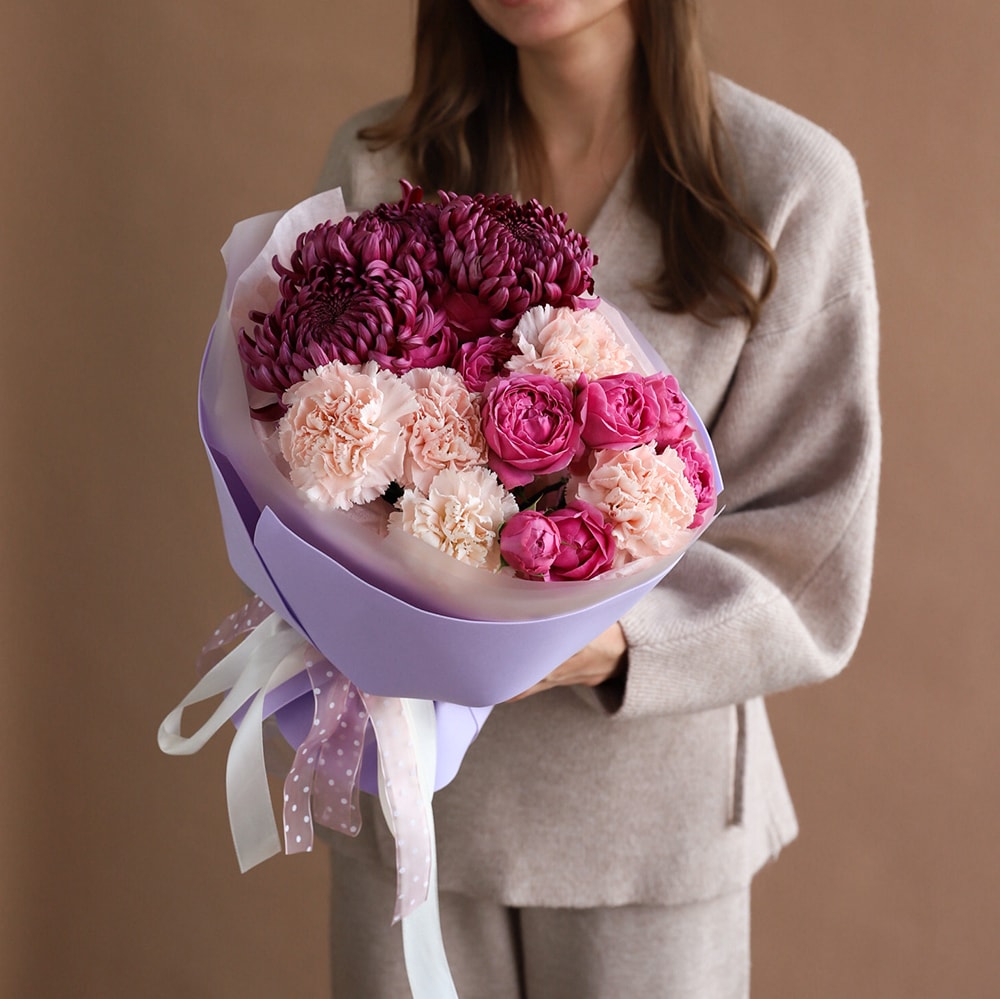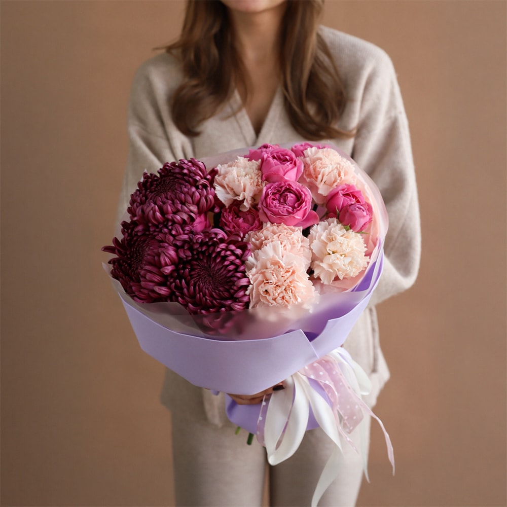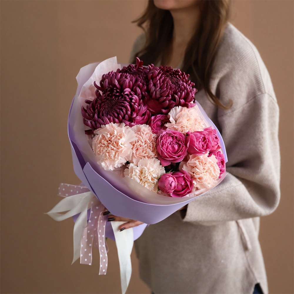 Элегантный букет в винно-пудровой палитре — сочетание насыщенных хризантем Bigoudi, нежных кремовых диантусов и роз Misty Bubbles. Лаконичное оформление подчёркивает стиль и глубину цвета.