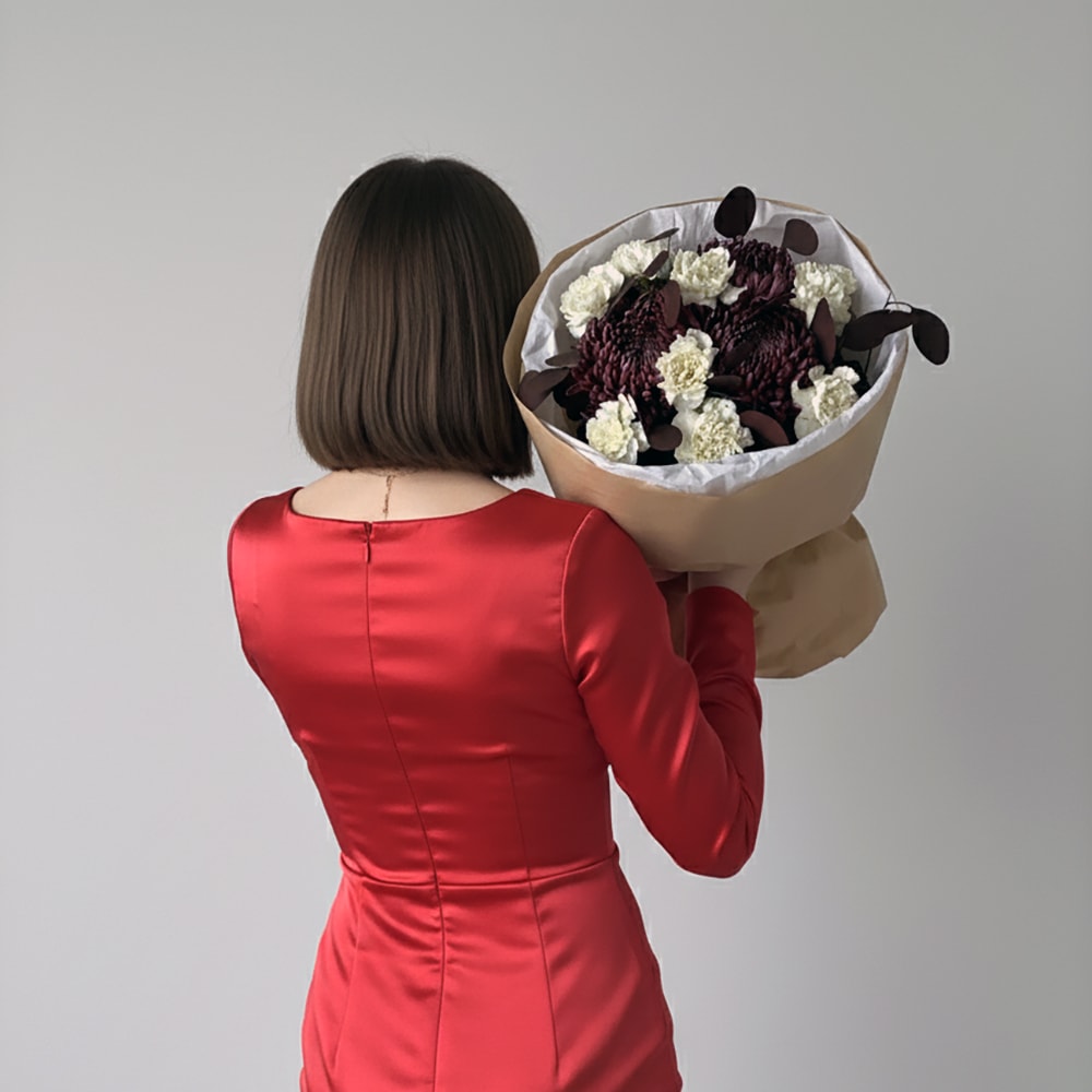 Контрастный букет в насыщенной винно-белой палитре - лаконичный, выразительный и стильный. Цветы Bigoudi в сочетании с белыми диантусами и акцентным эвкалиптом создают атмосферу осени и характера