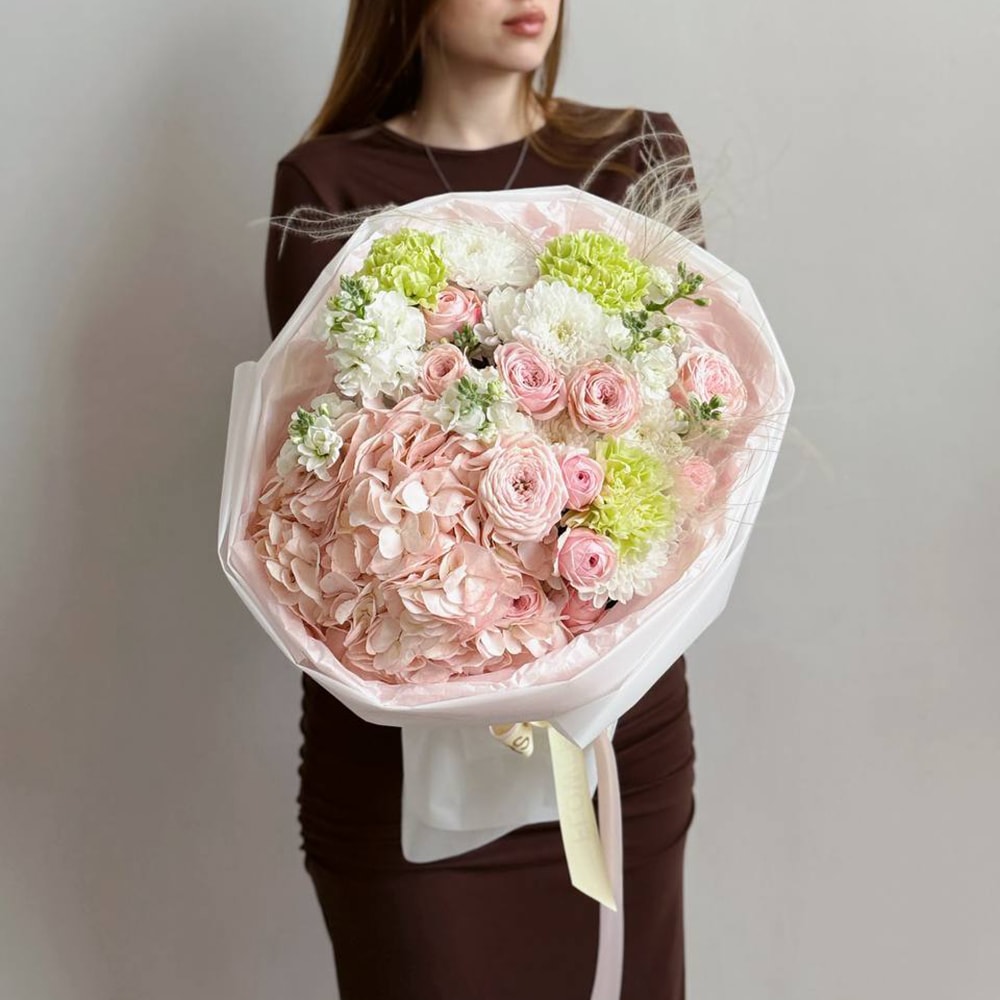 Состав: Гортензия - 1 шт., Маттиола - 2 шт., Хризантема Алтай - 2 шт., Кустовая пионовидная роза - 3 шт., Диантус - 3 шт., Стифа - 3 шт.