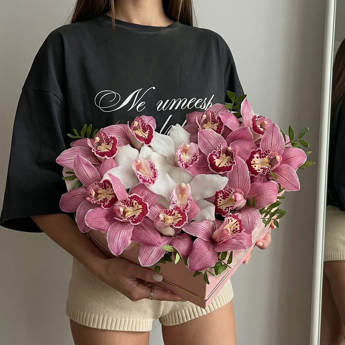15 розовых и белых орхидей в коробке сердце15 розовых и белых орхидей в коробке сердце