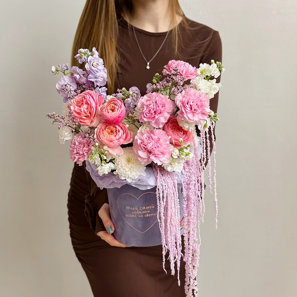 Цветочная композиция в фиолетовой шляпной коробке с надписью Моей самой любимой маме, букет с розовыми диантусами, маттиолой и свисающим амарантом