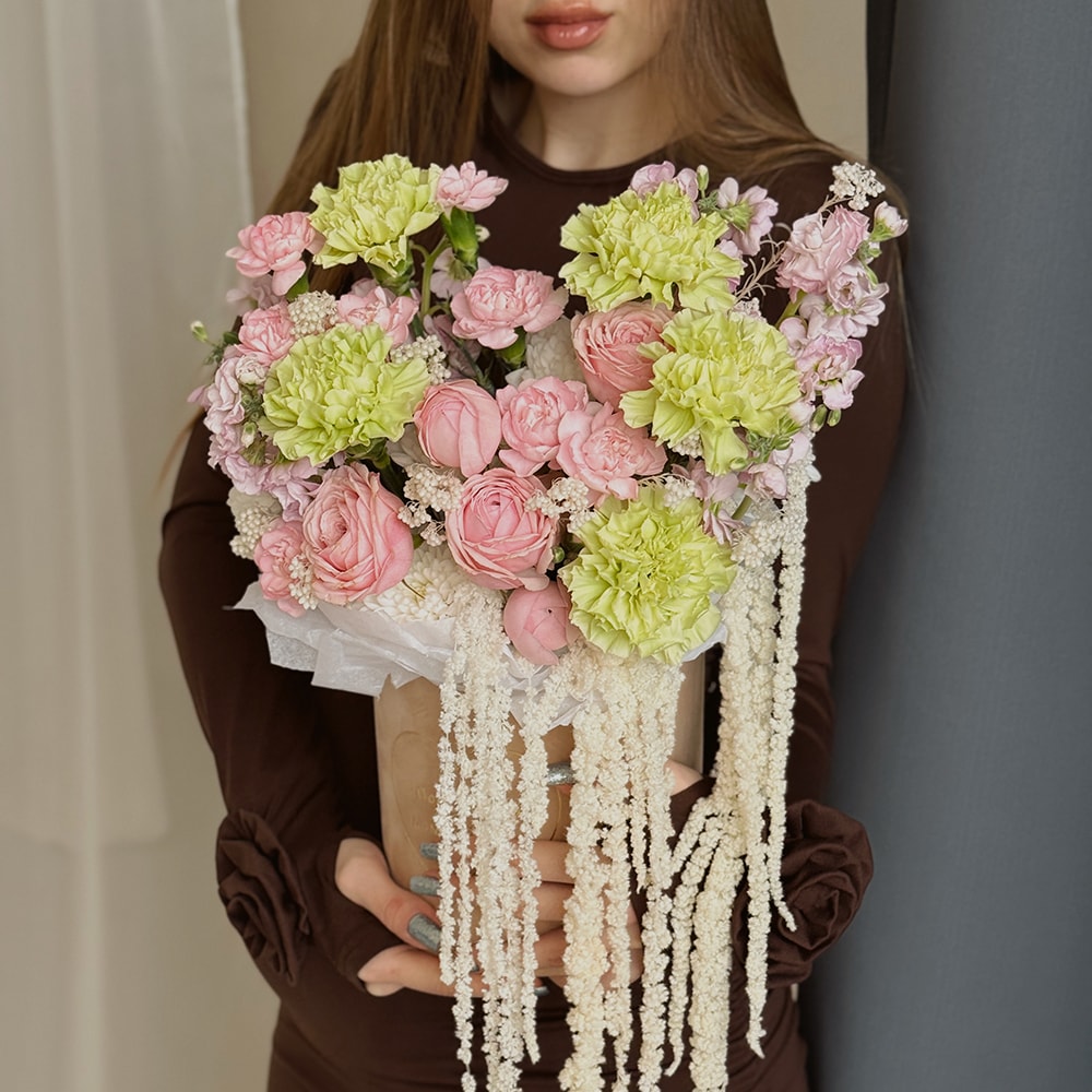 Состав: Диантусы — 5 шт., Кустовые диантусы — 4 шт., Кустовая пионовидная роза — 1 шт., Хризантема Алтай — 1 шт., Маттиола — 2 шт., Амарант — 1 шт.