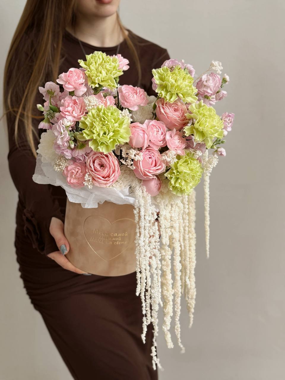 Букет в бежевой бархатной коробке с надписью для мамы, композиция с зелеными диантусами, розовыми розами, маттиолой и свисающим белым амарантом