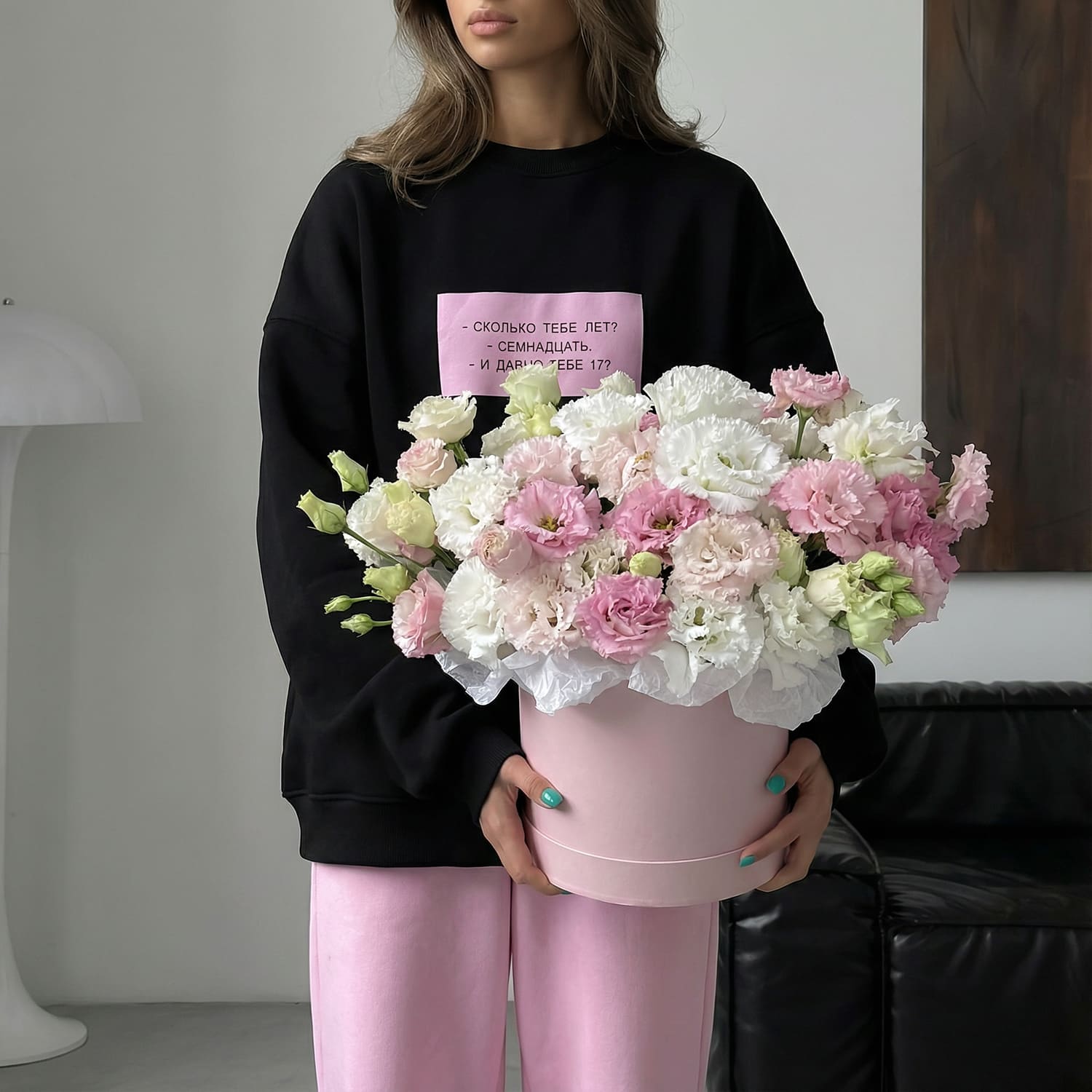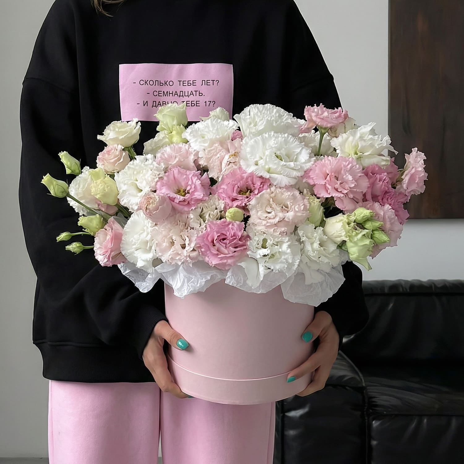 Состав: Эустома (микс белый/розовый) - 15 вет.; Шляпная коробка (розовая) - 1 шт.; Оформление (оазис)